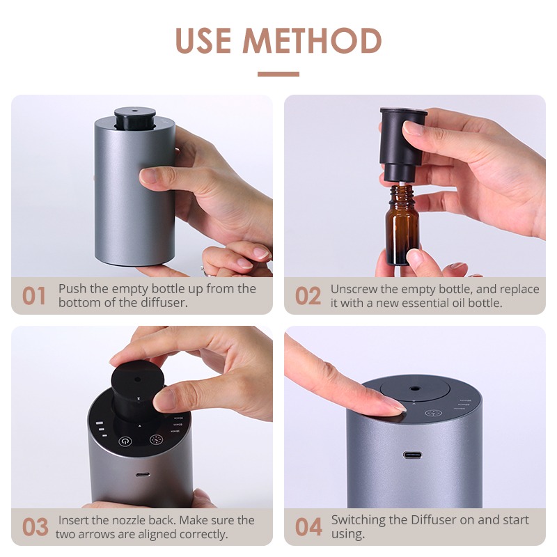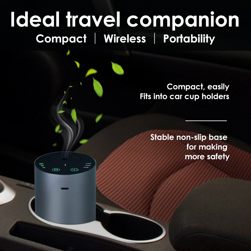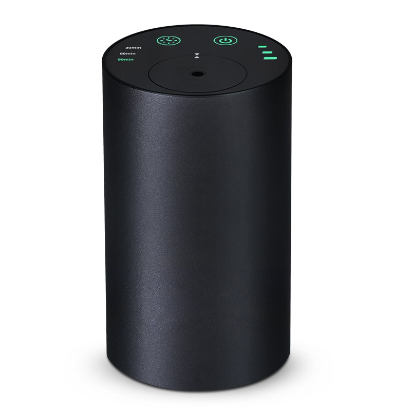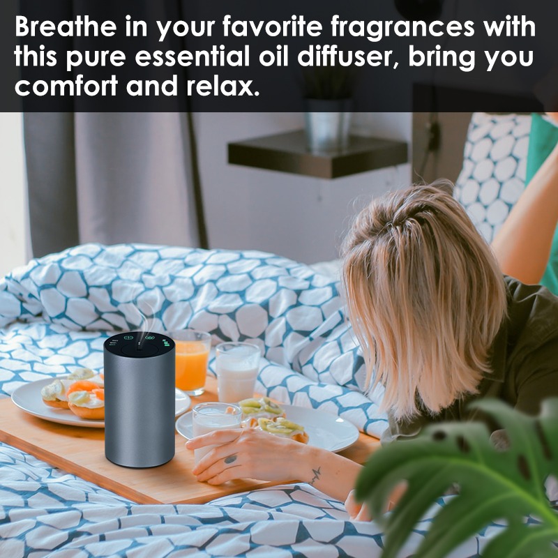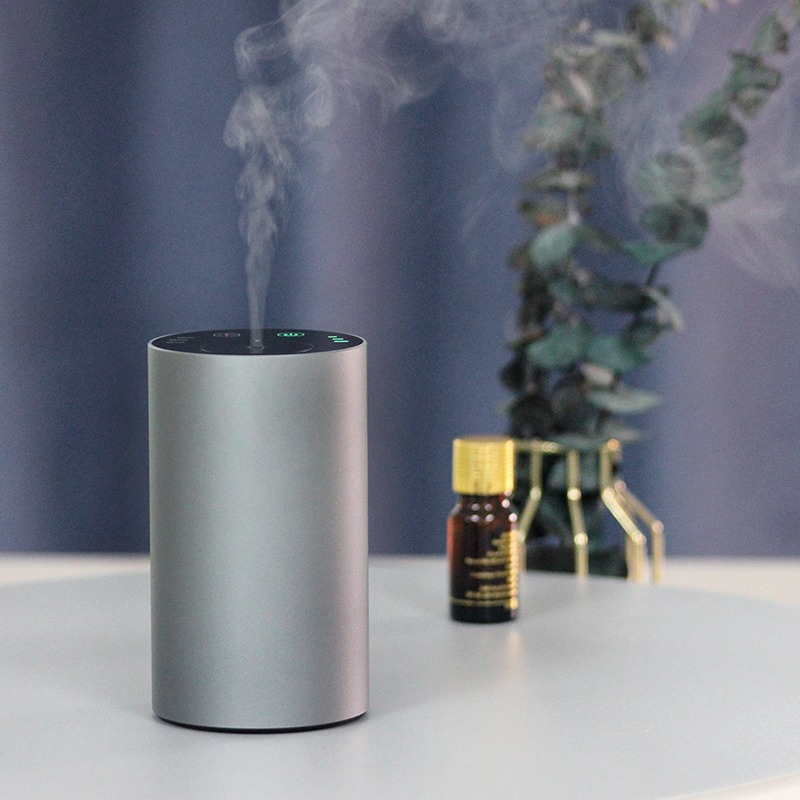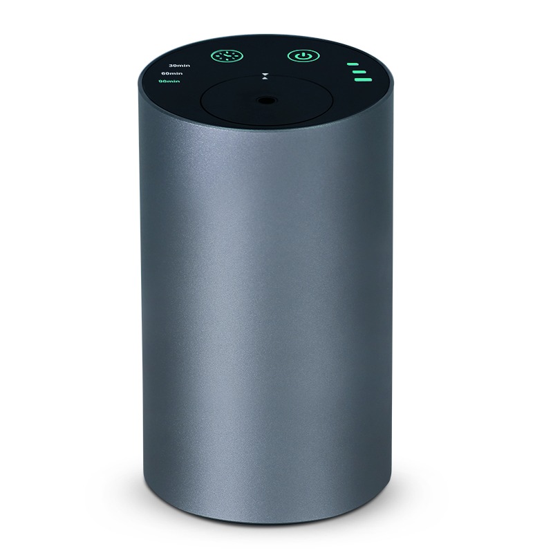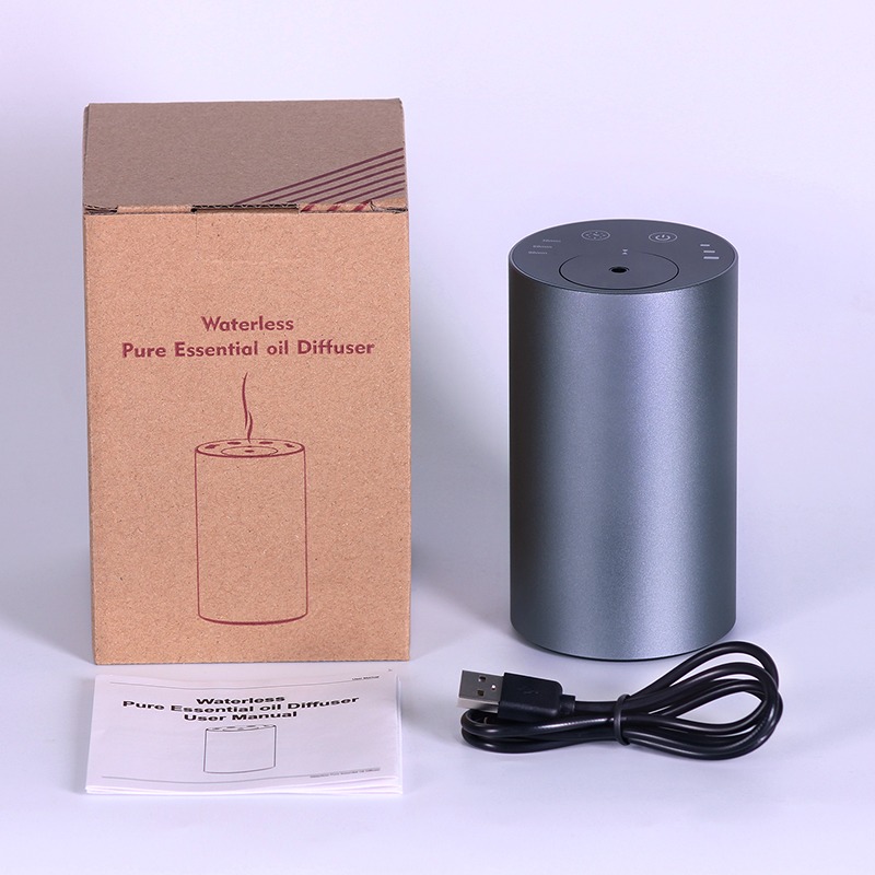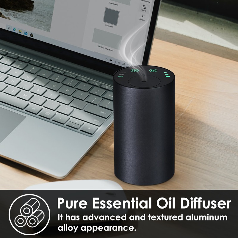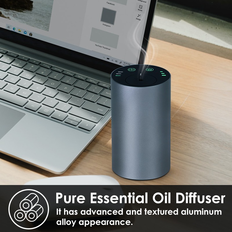 A smart waterless essential oil diffuser with aluminum body, adjustable timing modes, and powerful scent diffusion — designed for car, office, and modern living.