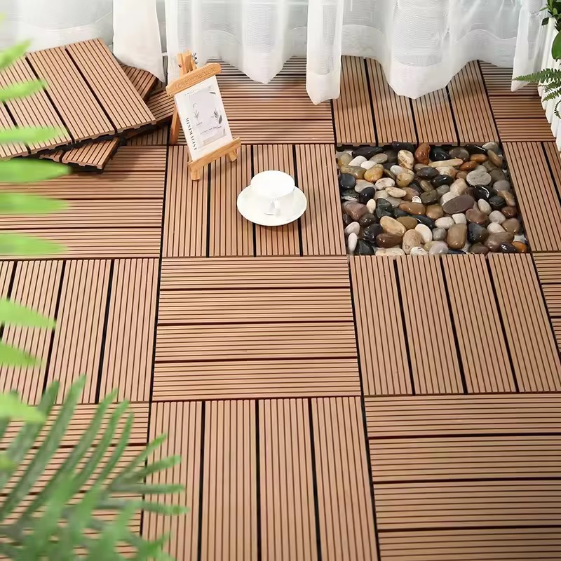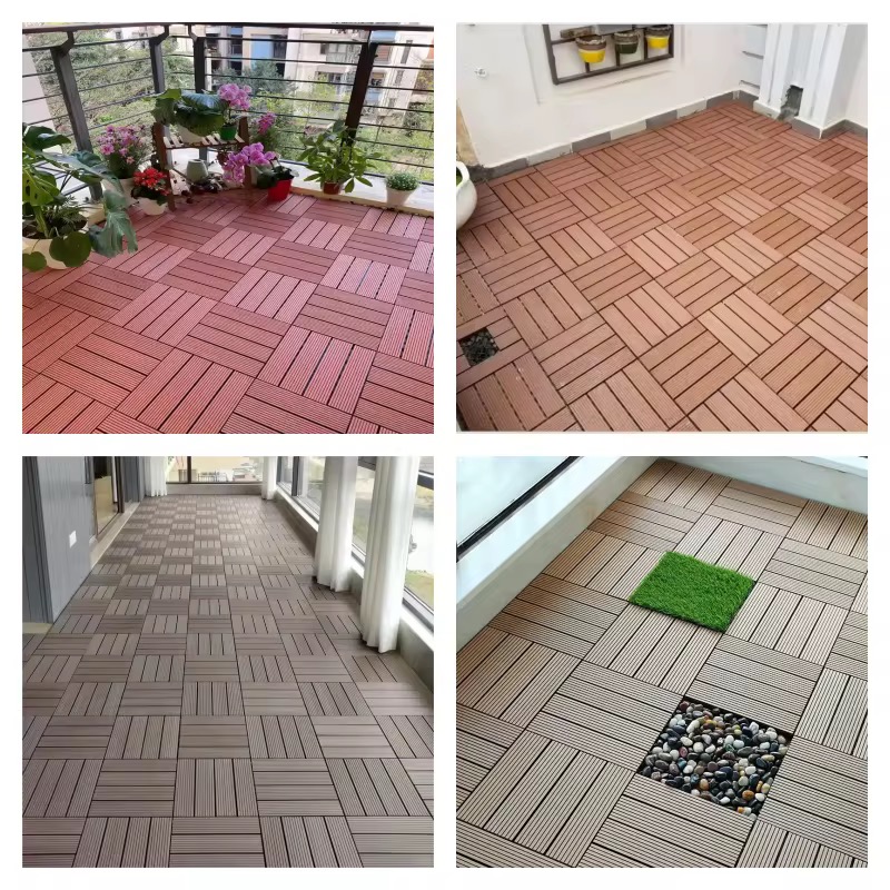Easy-to-install waterproof WPC deck tiles with interlocking system—perfect for balconies, patios, and indoor-outdoor spaces.