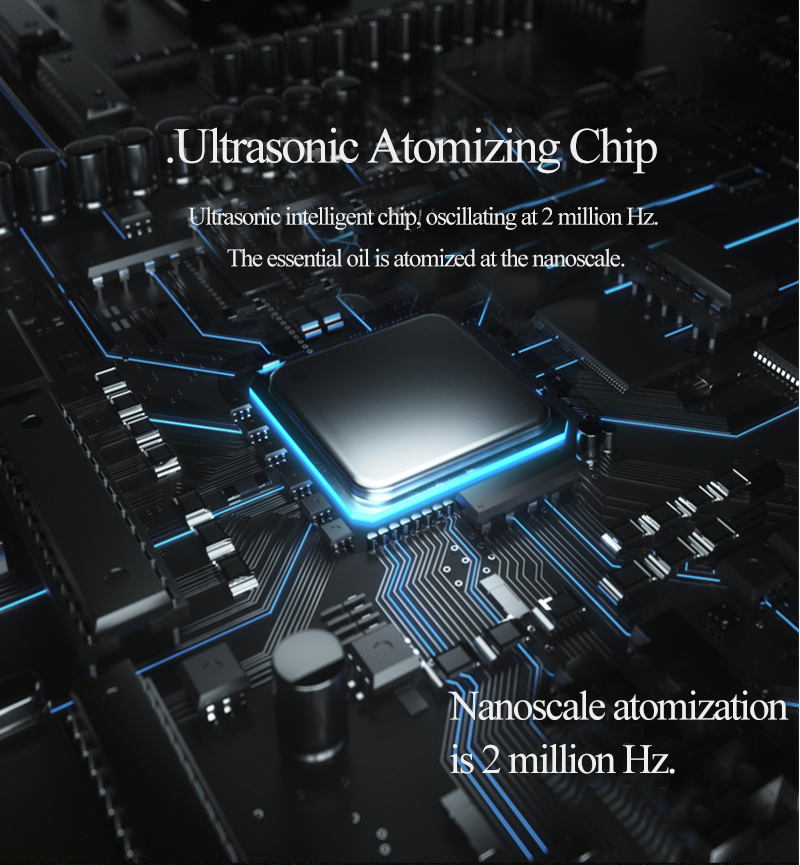 - Ultrasonic Atomizing Chip: Operates at 2 million Hz for nanoscale atomization, ensuring even and efficient diffusion of essential oils.