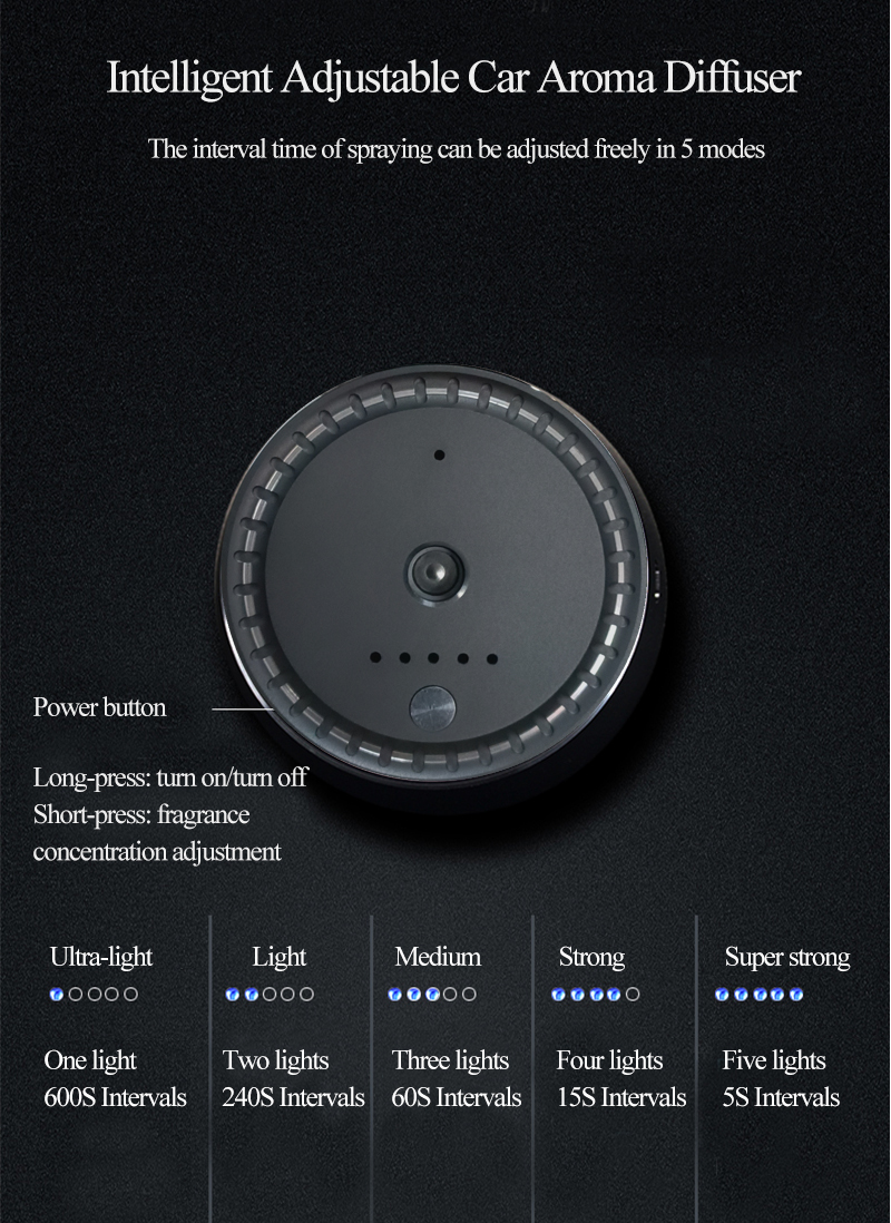 - Five Adjustable Modes: Choose from ultra-light, light, medium, strong, or super-strong fragrance intensities with interval control.