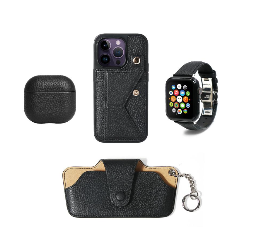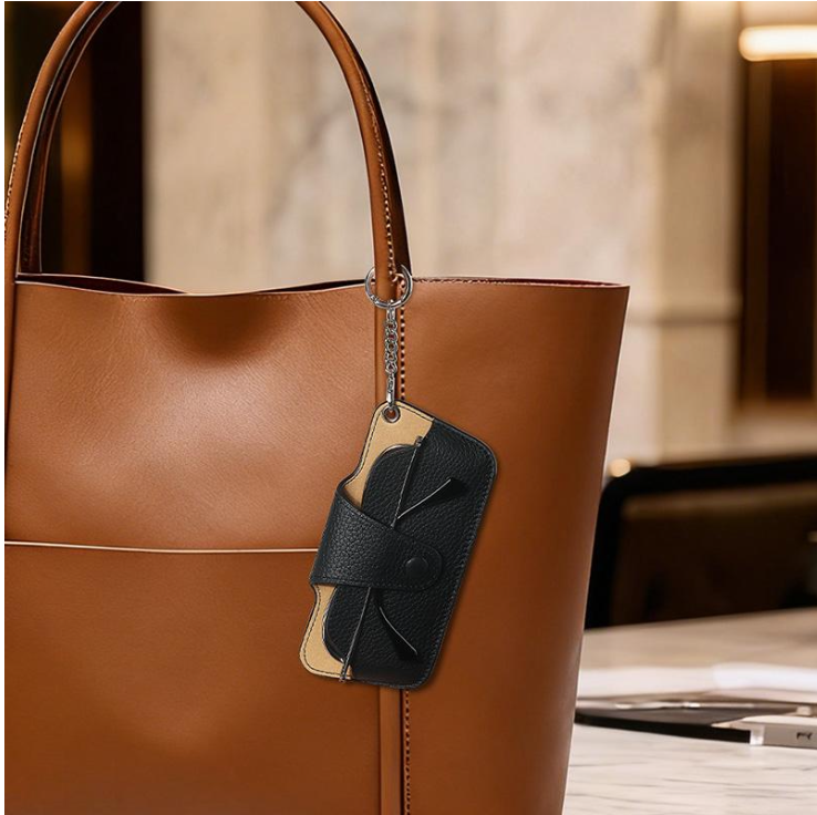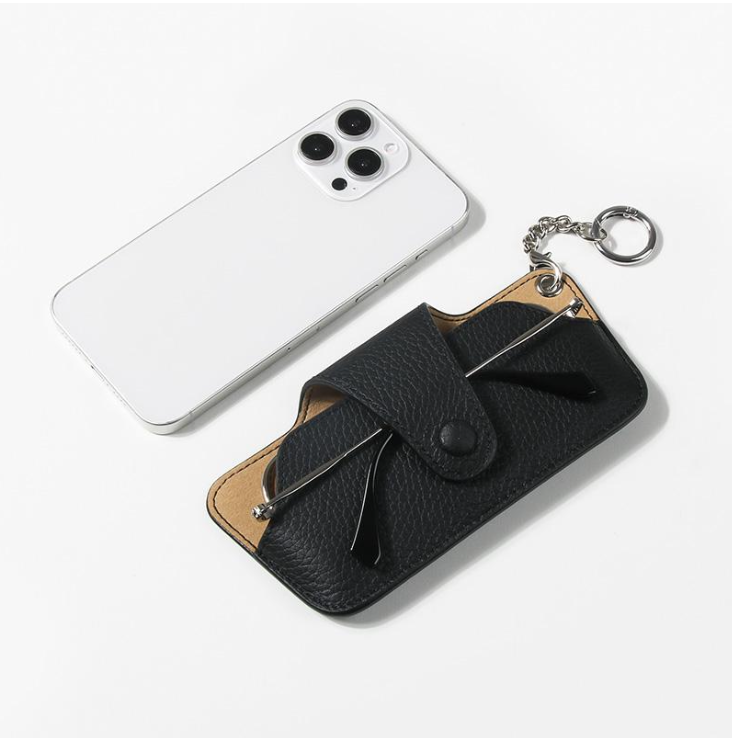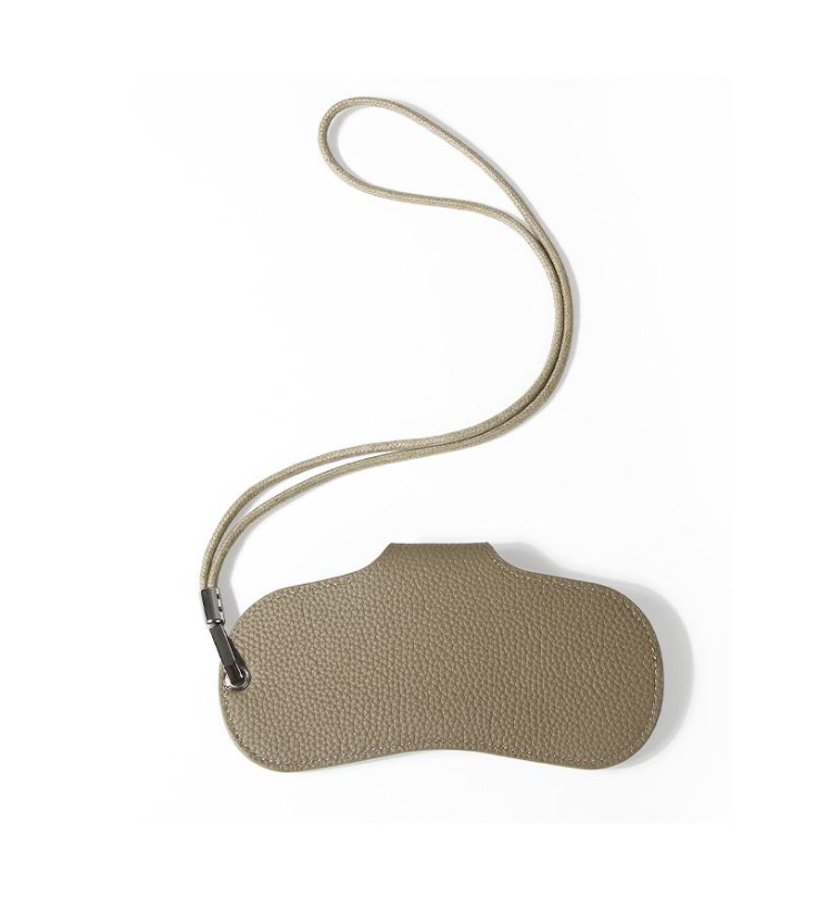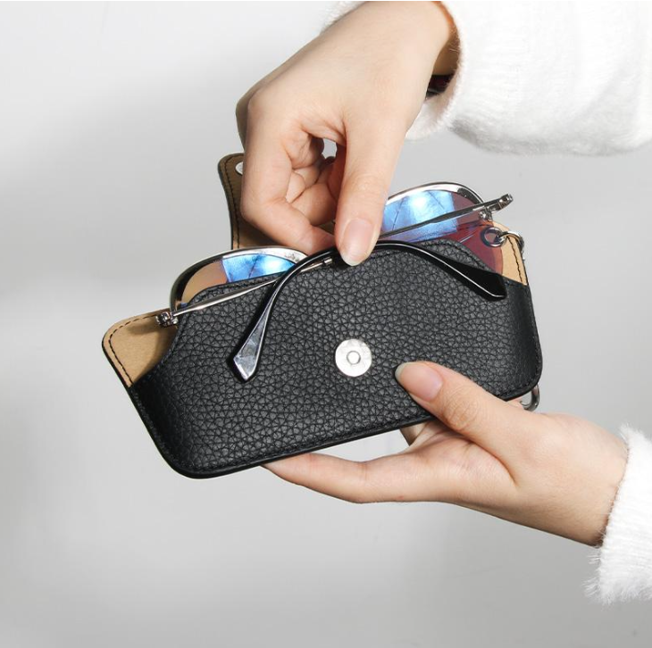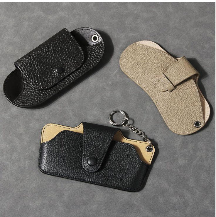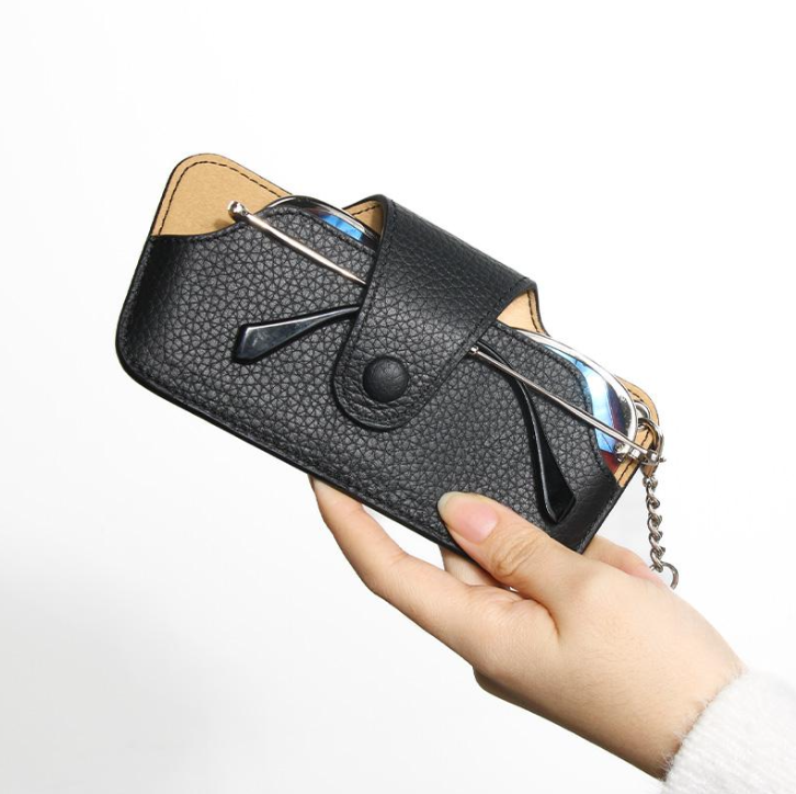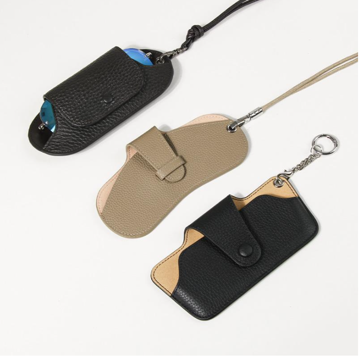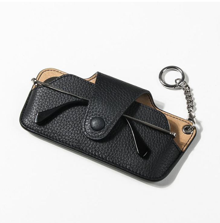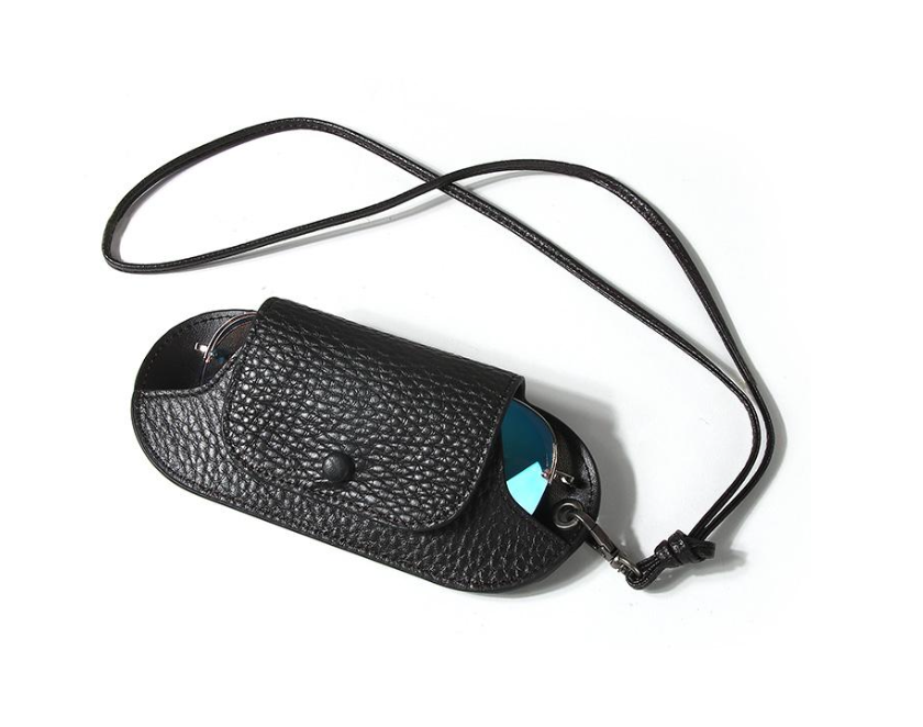 Minimal leather glasses case with snap closure, keychain hook, and optional strap—designed for everyday carry and travel convenience.
