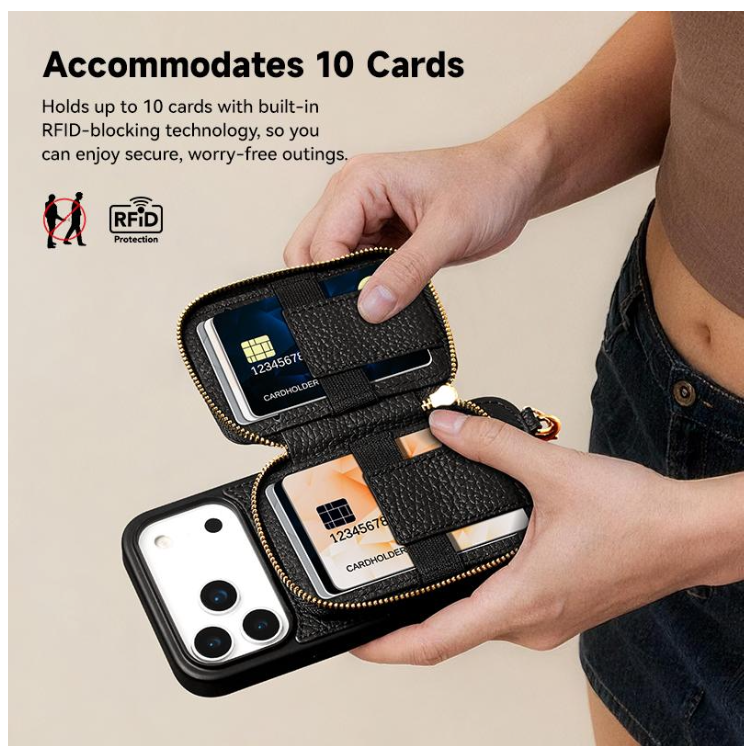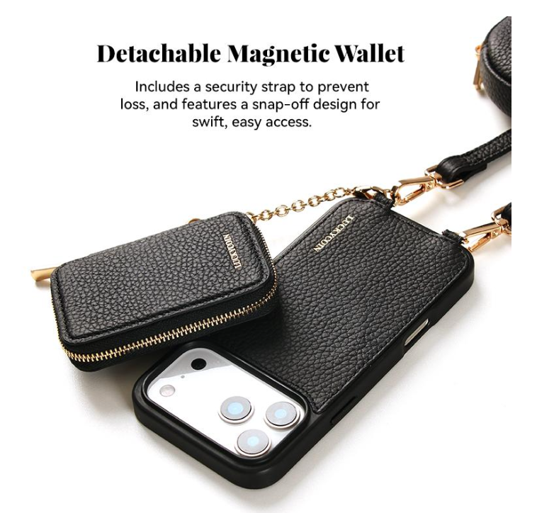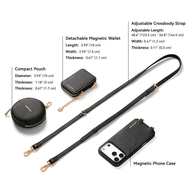 Includes a phone case, detachable magnetic wallet, and round pouch—use together or separately.