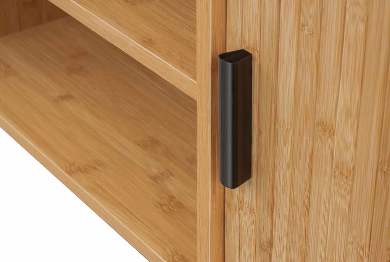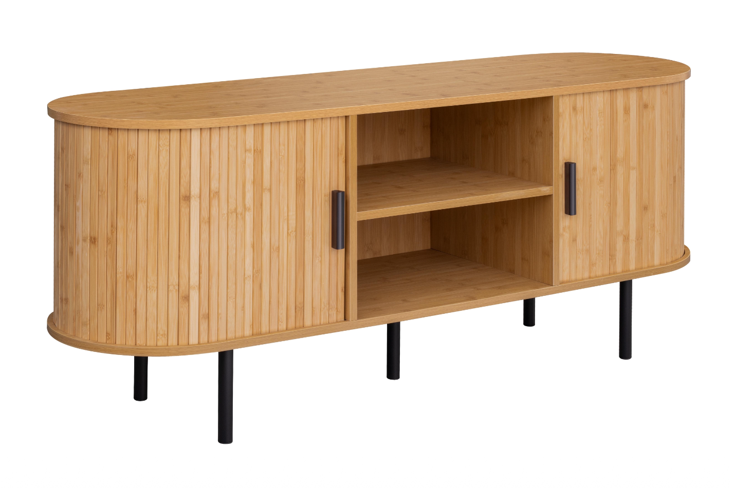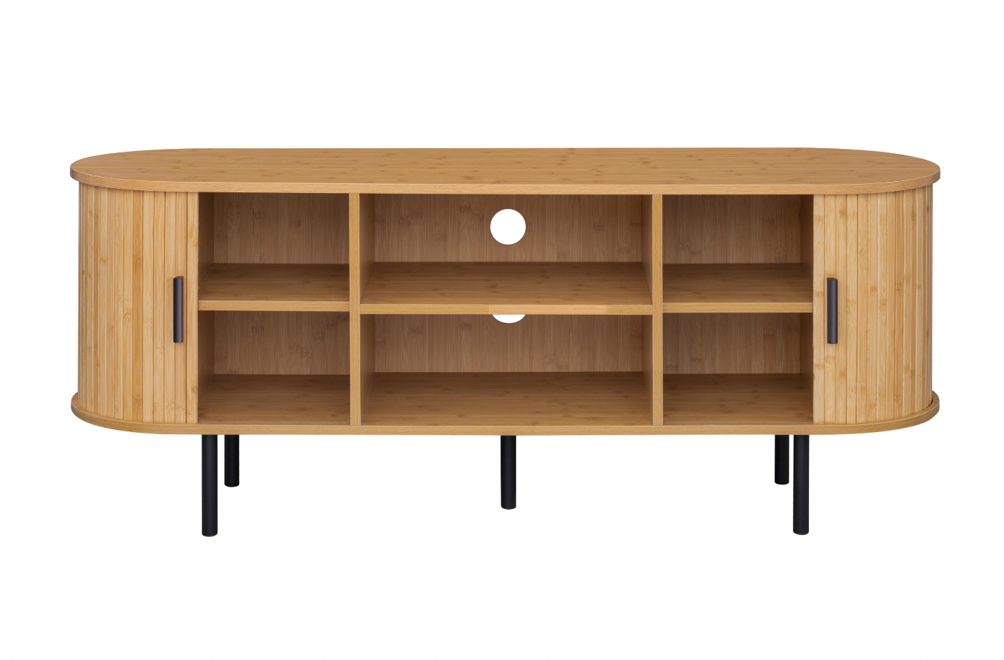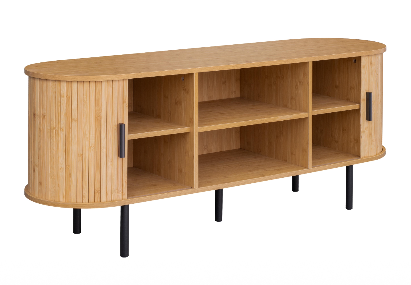 Stylish bamboo TV stand with sliding doors, open shelving, and cable management—perfect for modern living spaces.