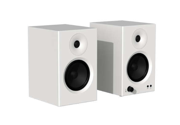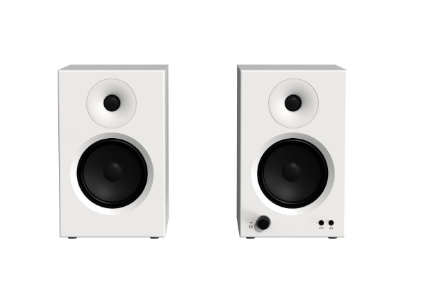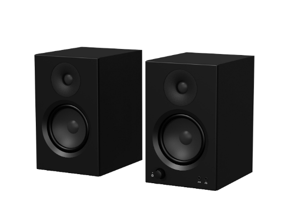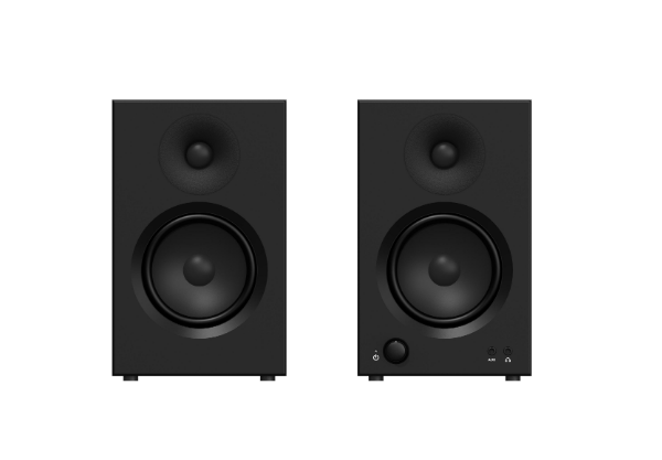 High-performance desktop monitor speakers with dual 20W + 10W output, wooden cabinet construction, balanced input support, headphone output, and 4-inch bass driver—designed for professionals and audiophiles.