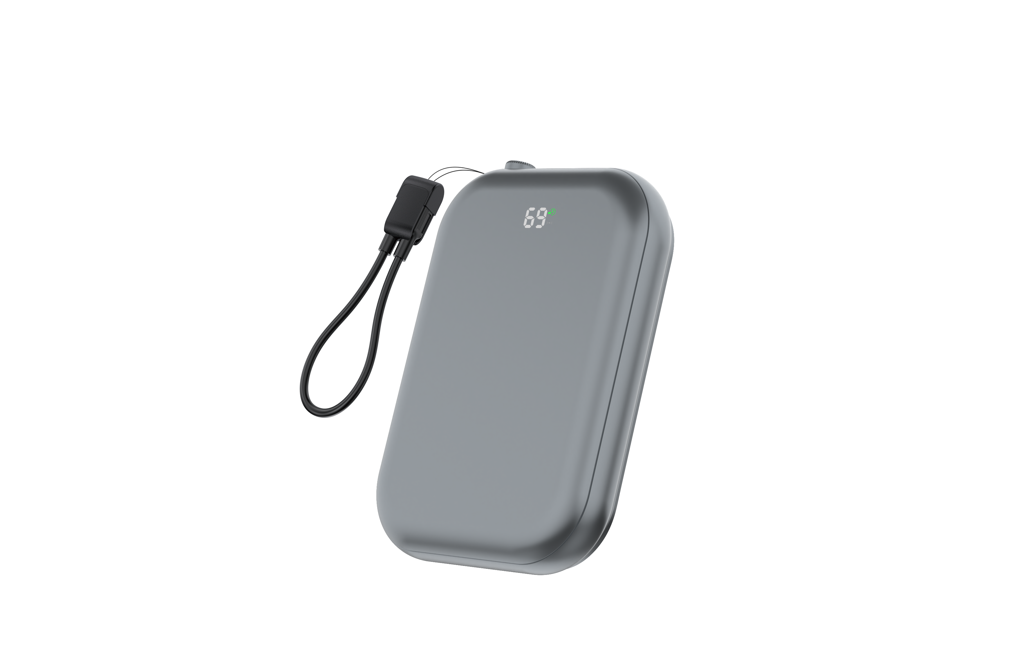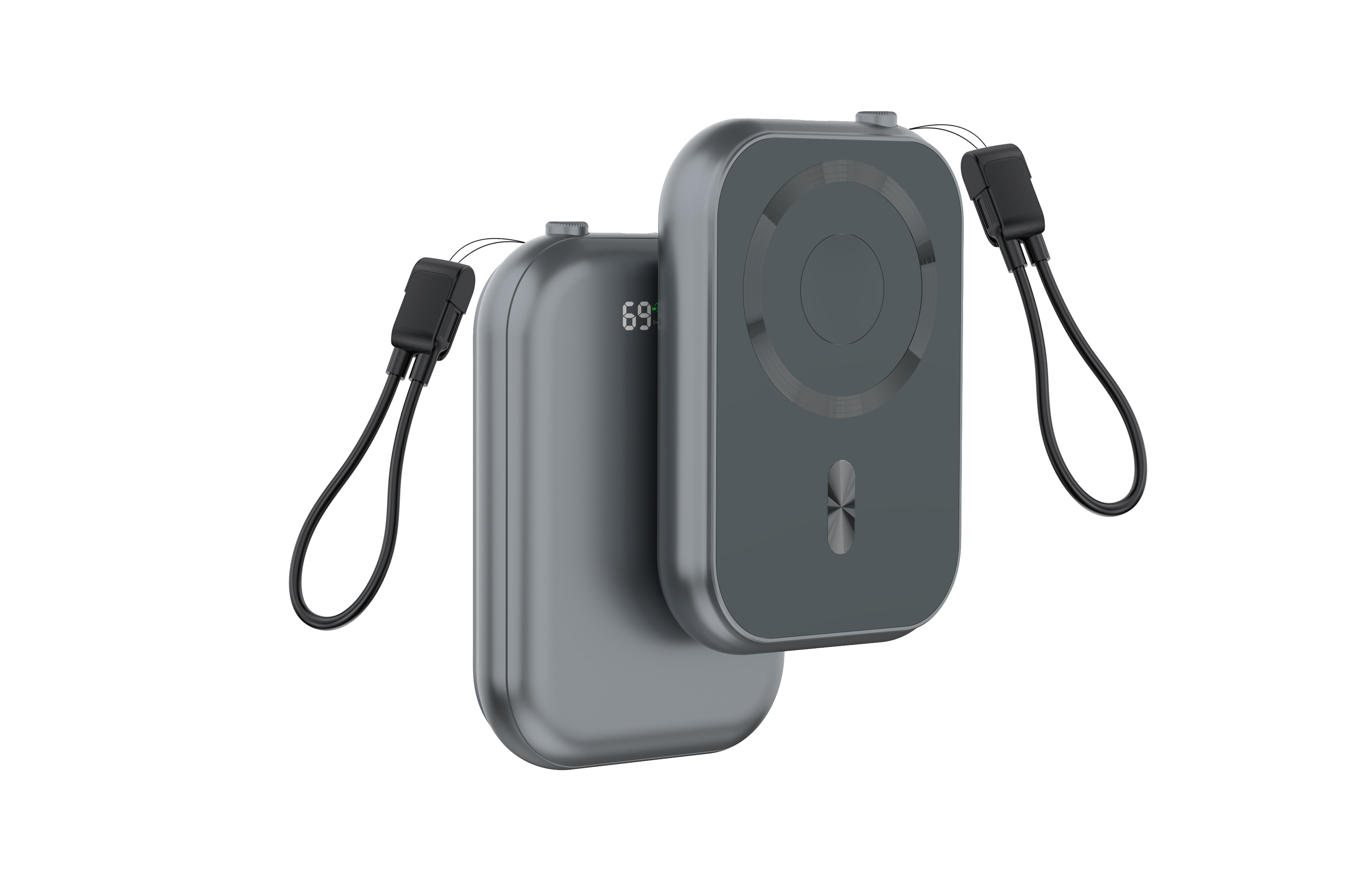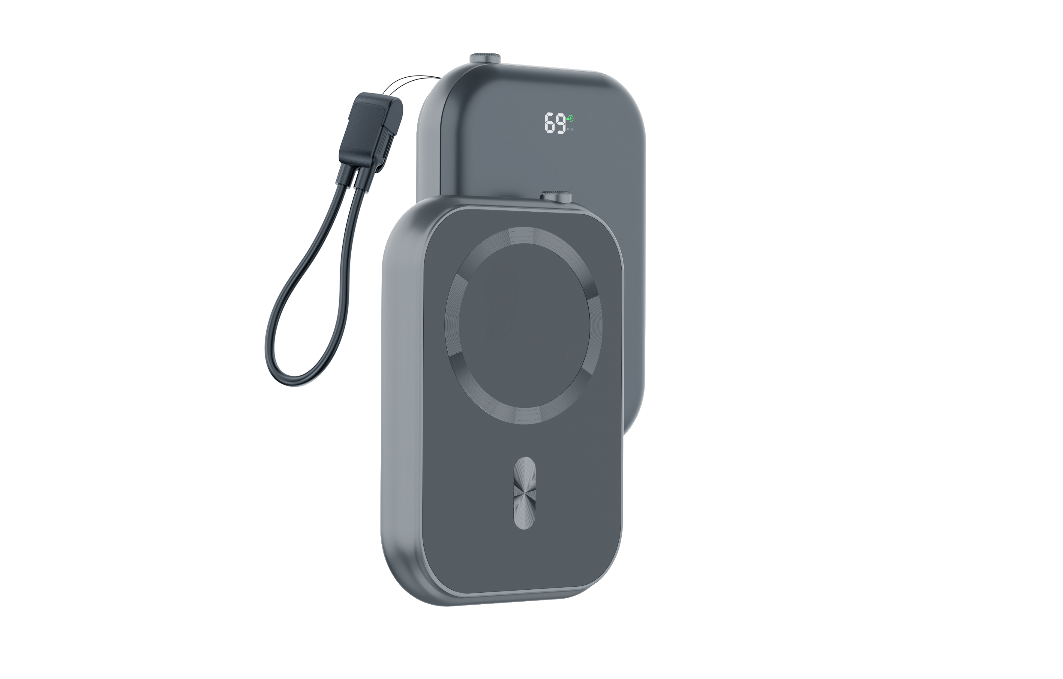 Pocket-size magnetic wireless power bank with a soft-touch finish, LED battery display, and a detachable wrist lanyard — made for hands-free, on-the-go charging.