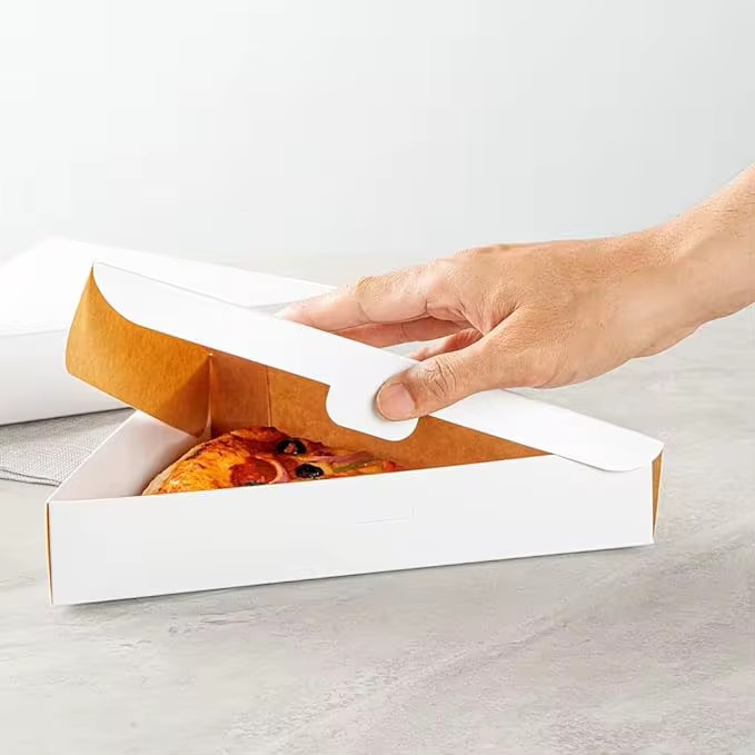 Durable oil-proof clamshell pizza slice box designed for takeout, delivery, and restaurant use. Keeps slices fresh, secure, and mess-free.