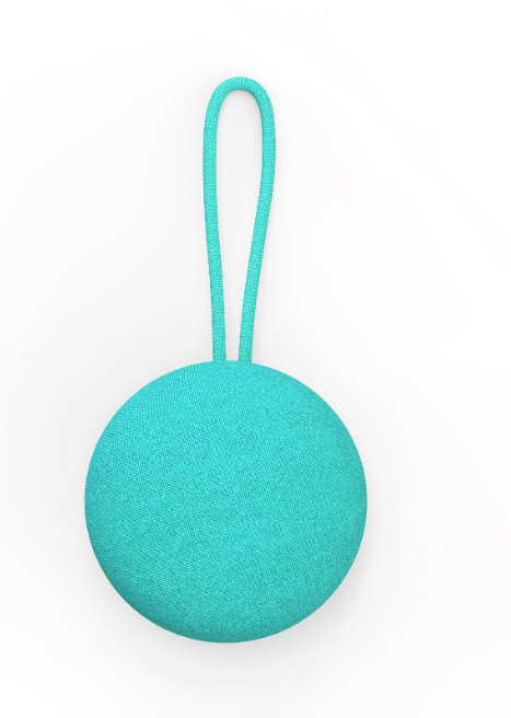 - Compact circular design with a soft fabric exterior and carrying loop.