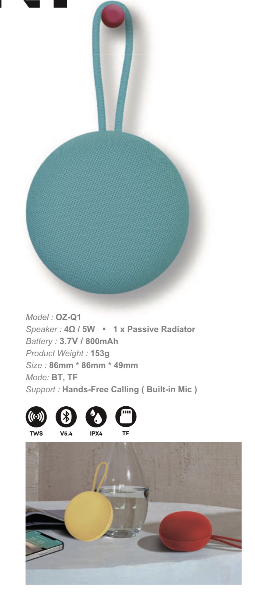 Portable Fabric Bluetooth Speaker OZ-Q1 – IPX4 Waterproof, TWS, BT 5.4, 5W Output