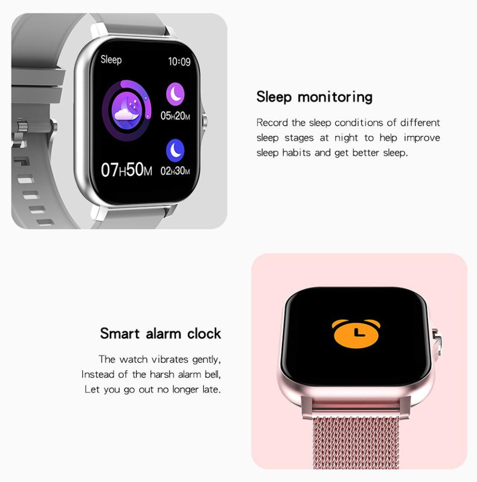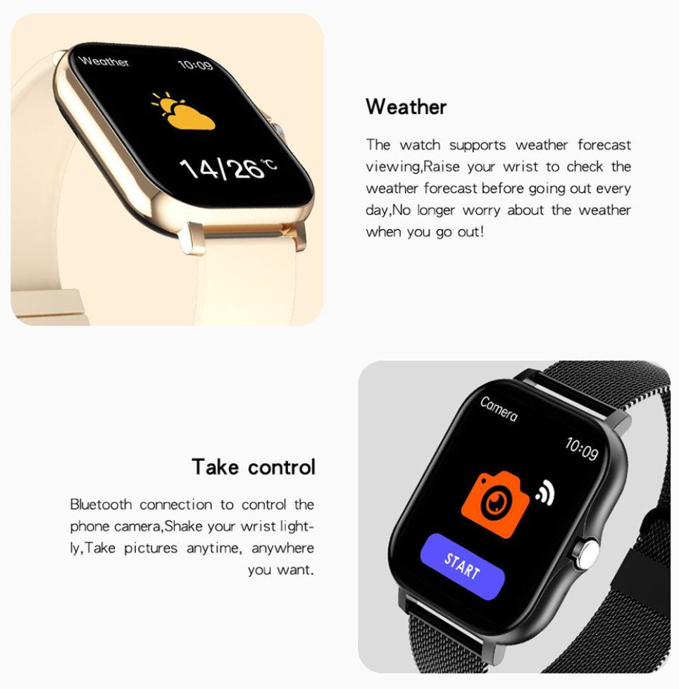 Functions: Fitness Tracking, Sleep Monitor, Weather Forecast, Camera Control, Alarm Clock