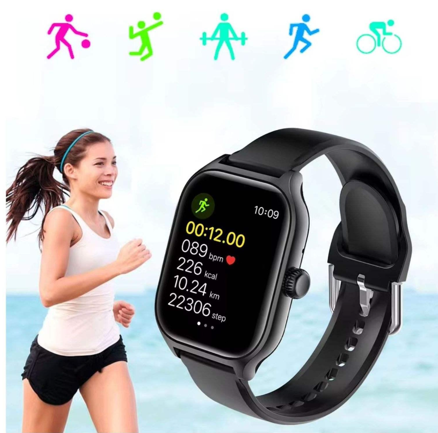 Stylish touchscreen smartwatch with fitness tracking, heart rate monitoring, sport modes, and real-time smartphone notifications.