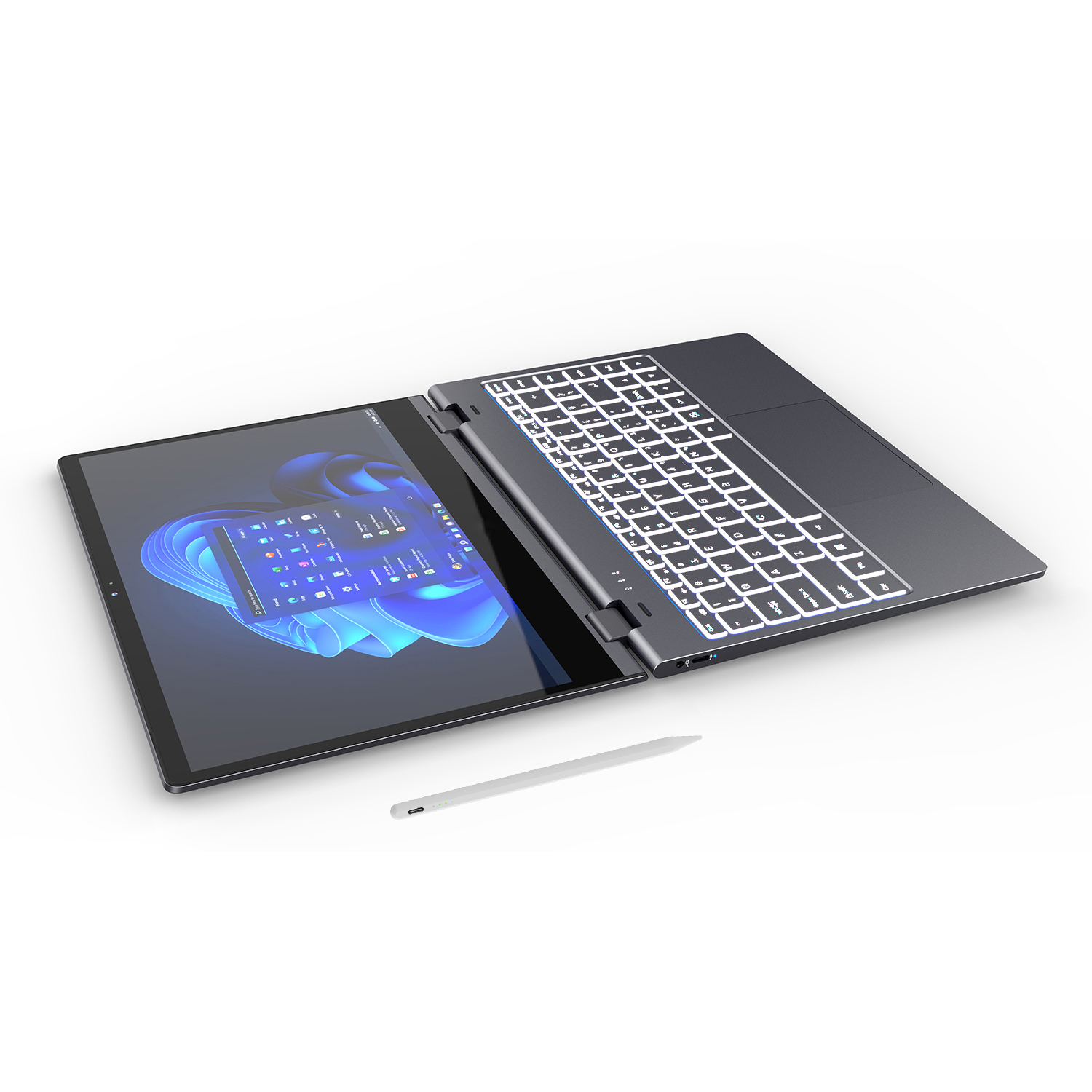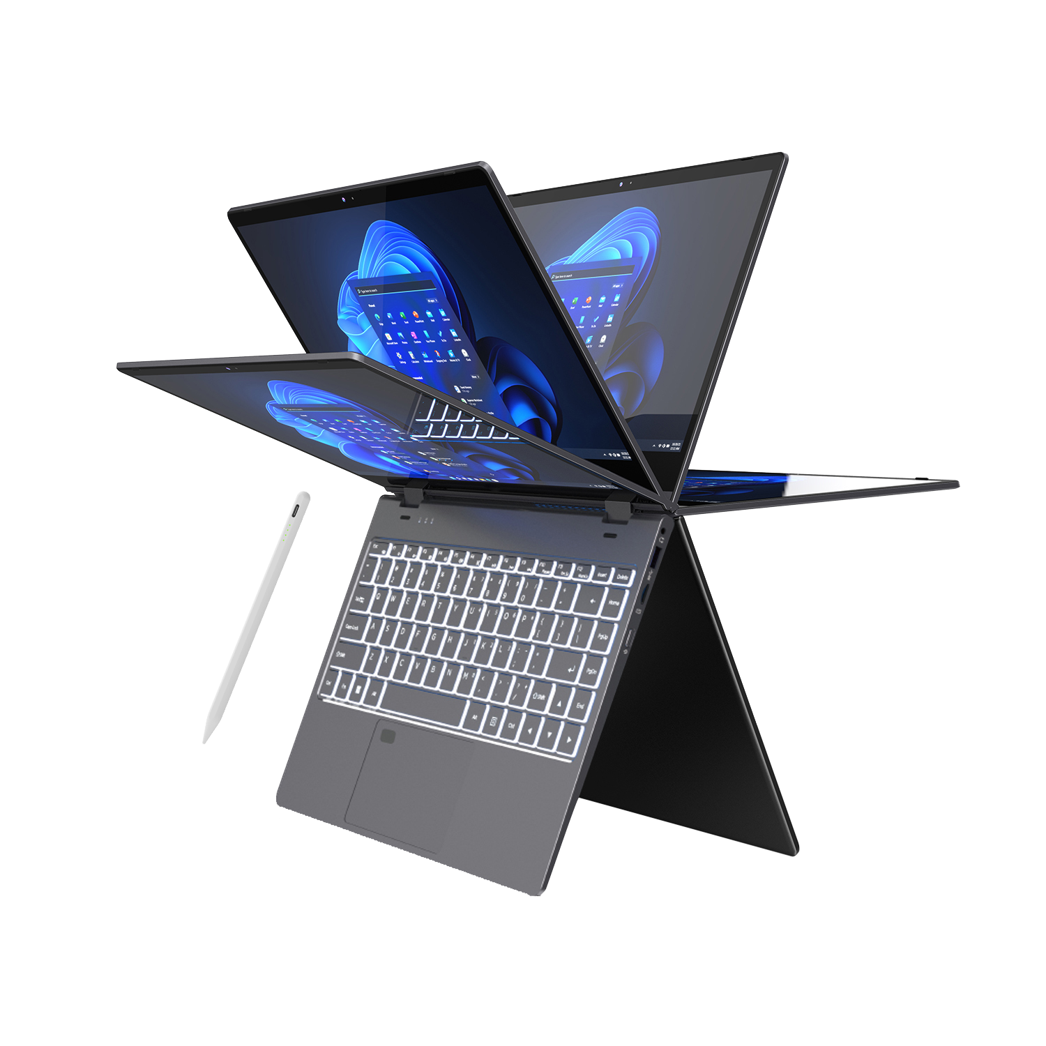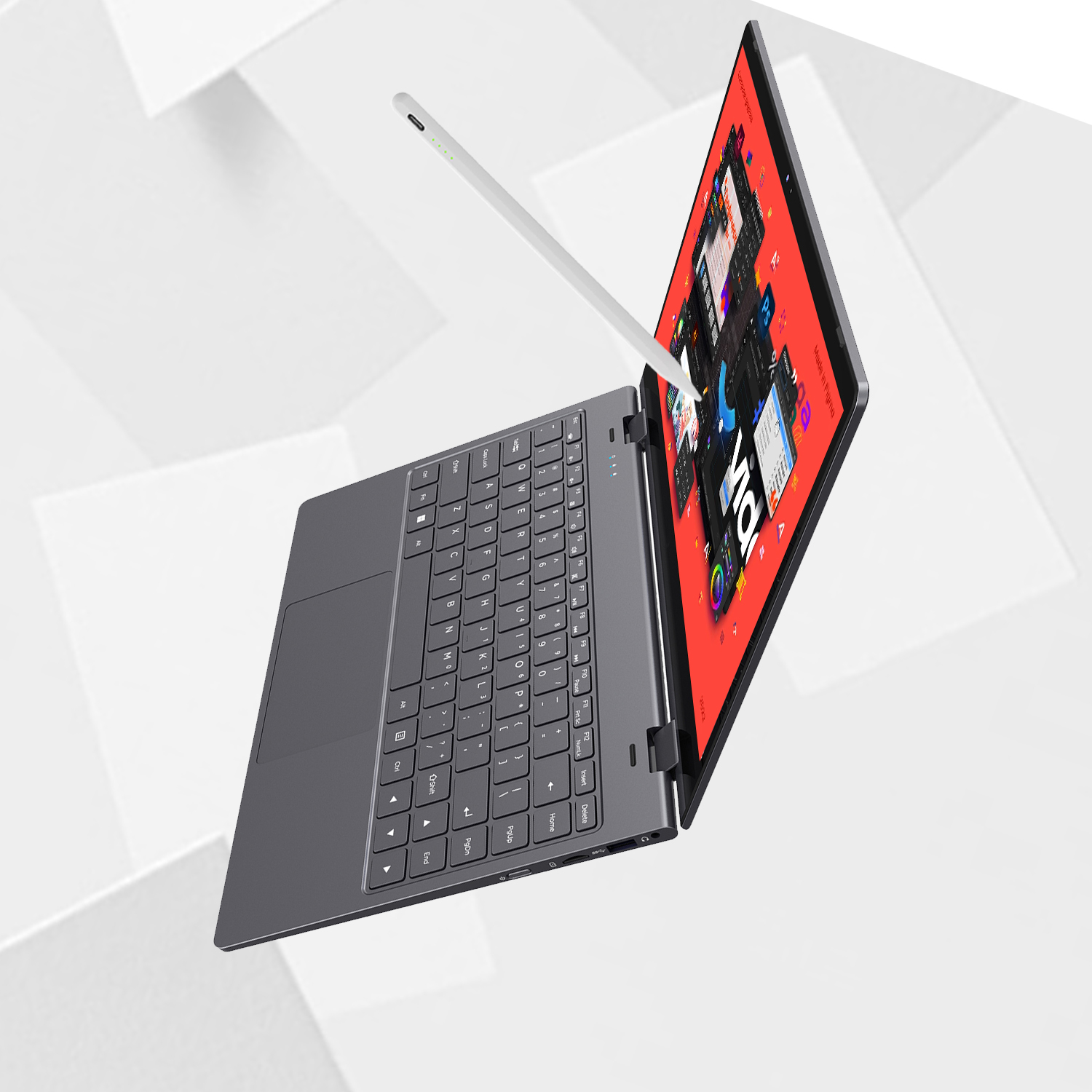 14-inch Full HD touchscreen laptop powered by Intel N100 with 360° convertible design, fingerprint unlock, and USB-C charging.