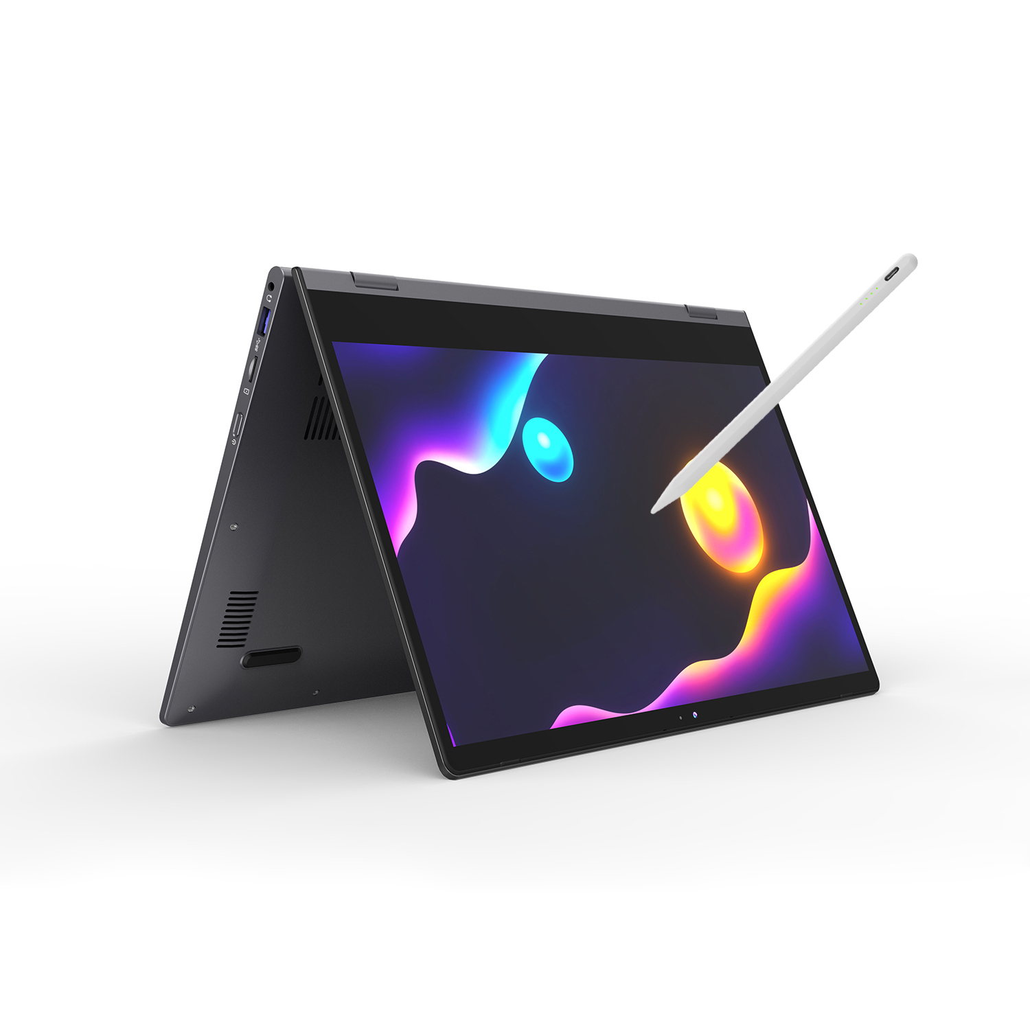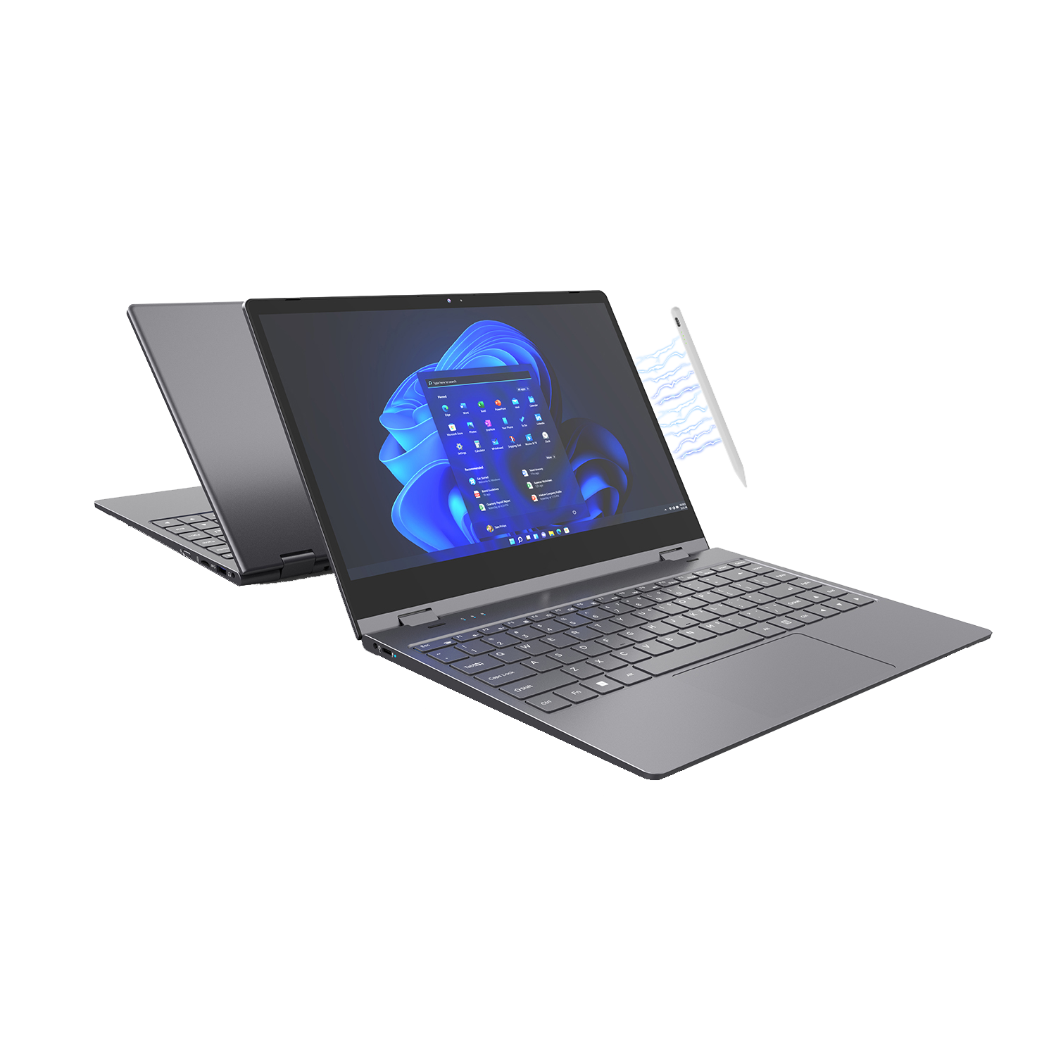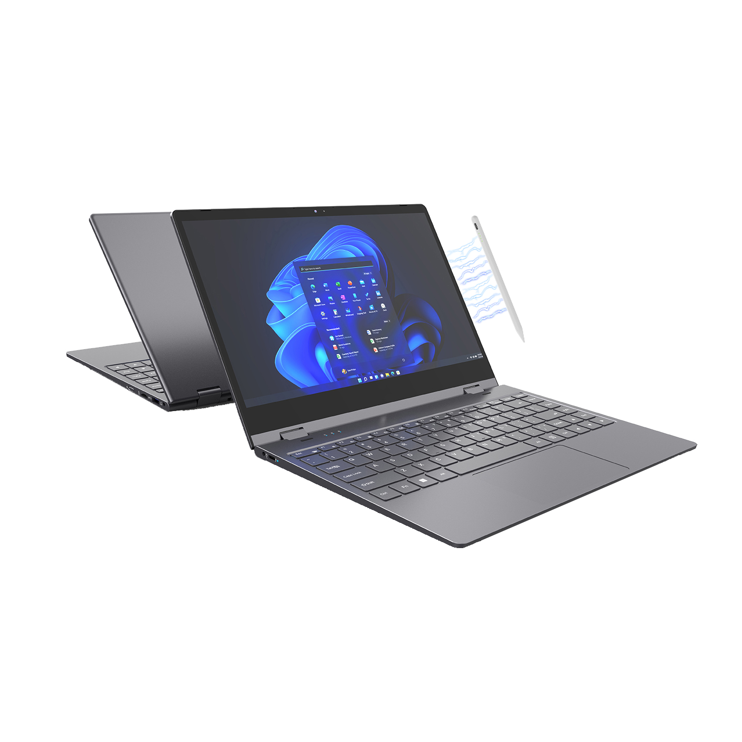 14-inch Full HD touchscreen laptop powered by Intel N100 with 360° convertible design, fingerprint unlock, and USB-C charging.
