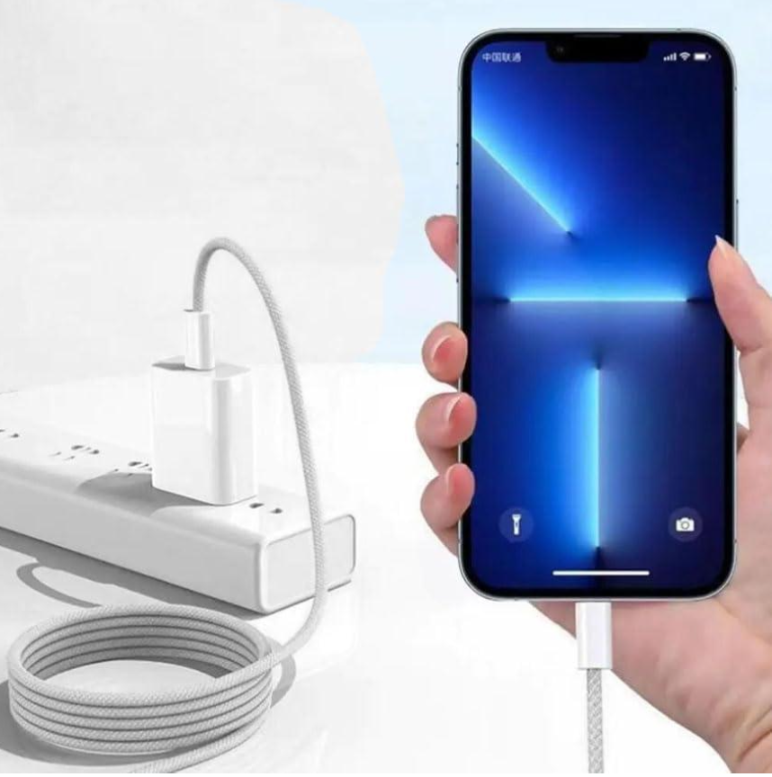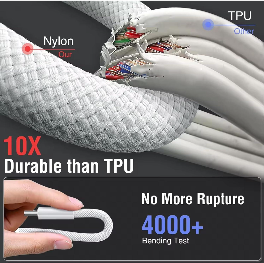 Durable braided USB-C fast charging cable for iPhone 15 and USB-C devices with reinforced nylon design and high-speed charging.